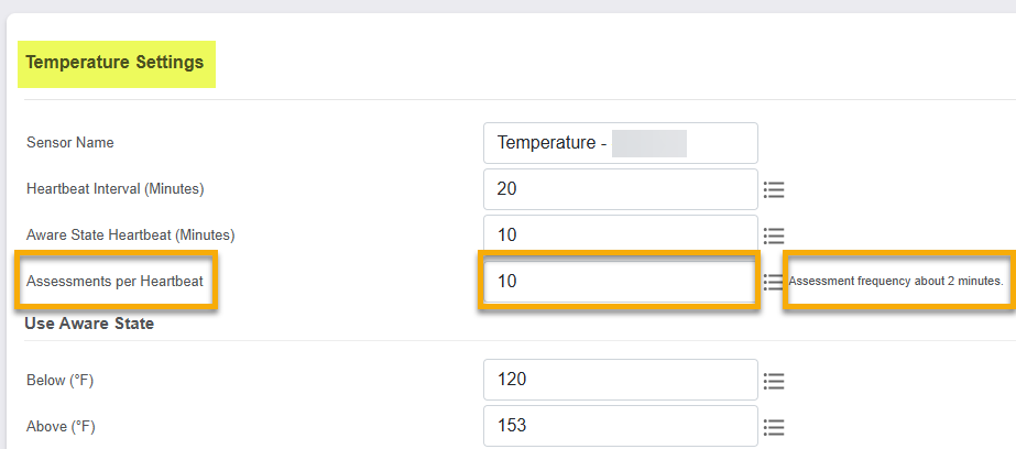 Suppose you want the sensor to check against the Aware State Threshold and report a reading before that scheduled Heartbeat. In that case, you must change the Assessments per Heartbeat configuration to allow the sensor to check the condition with the desired frequency.