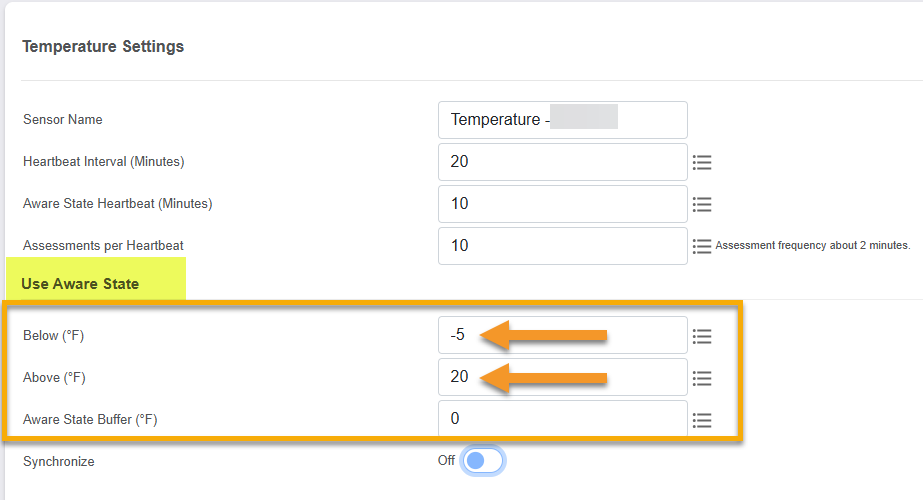 In the above example, the sensor checks in every 20 minutes (Heartbeat set to 20), conducts assessments every two minutes (Assessments set to 10), and checks for a temperature below -5°F (Aware State Threshold Below) or above 20°F (Aware State Threshold Above).